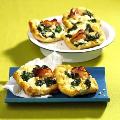 Season with salt. Put the spinach on a sieve and let it drain. Place puff pastry slices next to each other on a floured work surface and cut in half. Crumble the feta cheese into a bowl. Stir in sour cream and egg.
