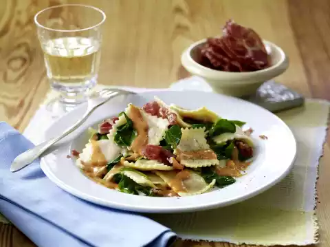 Fry Coppa ham without fat in a large pan until crisp, remove and drain on kitchen paper. Arrange ravioli with tomato cream sauce, spinach and coppa chips. Sprinkle with pepper.