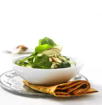 Heat olive oil until it almost smokes. Drizzle over the spinach, turning the spinach constantly. Add apple sauce and mix. Sprinkle with almonds.