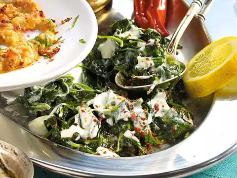 Season with salt and pepper, take the pot off the stove and let it cool down a little. Mix yoghurt, lemon juice and 3 tablespoons of olive oil. If necessary, drain the spinach a little and mix carefully with the yoghurt sauce. Arrange on a deep plate and sprinkle with sumac. Serve lukewarm or cold
