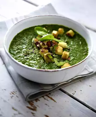 Add spinach and sorrel to the stock, bring to the boil and simmer for about 2 minutes. Finely puree the soup, season to taste with salt and nutmeg. Cut remaining sorrel into strips. Serve the soup and sprinkle with bread cubes, sorrel and garnish with spinach