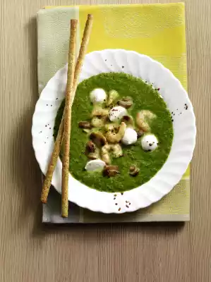 Clean the mushrooms, wash and halve them. Heat oil in a pan. Fry the mushrooms for 3-5 minutes until golden brown. In the meantime, put spinach, milk and stock in a pot and bring to the boil over medium heat, stirring occasionally. Remove mushrooms from the pan. Add shrimps and 2 tablespoons of water to the pan and cook over medium heat.