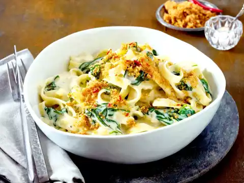 Pour the noodles and spinach onto a sieve, collecting some cooking water. Drain the noodles. Stir lemon zest into the sauce, season with salt, pepper and lemon juice. Fold the noodles into the sauce, heat up briefly, adding some pasta cooking water if necessary.