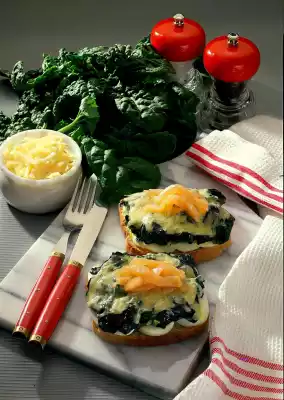 Spread slices of egg and spinach on top. Coarsely grate the cheese and sprinkle over the slices of toast. Bake in the preheated grill until the cheese is completely melted. Cut salmon into strips and spread on the toasts.