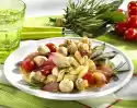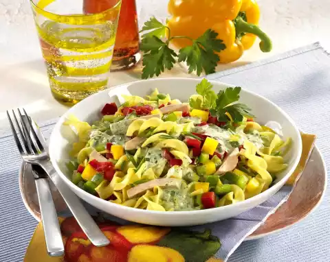 Cook the pasta in boiling salted water for 6-8 minutes. Drain, rinse with cold water, drain and let cool. In the meantime, quarter the peppers, clean, wash and cut into small cubes.