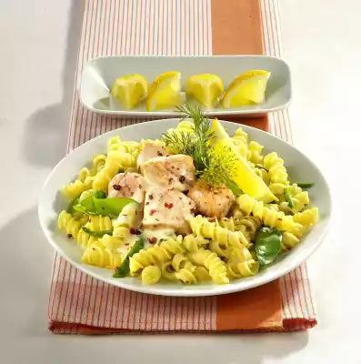 Wash the salmon, dab dry, cut into large pieces and sprinkle with 2 tablespoons of lemon juice. Clean and wash the mangetouts and cut them lengthwise into strips. Put pasta in boiling salted water and cook for 10 minutes. Add sugar snap peas to the noodles 3 minutes before the end of cooking time. Heat the oil in a frying pan.