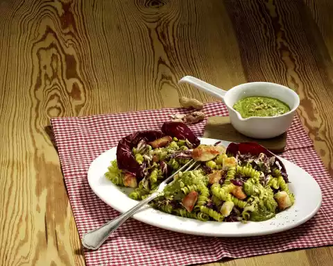 Cut the leaves into strips, except for a few for garnishing. Drain the pasta. Mix immediately with half of the pesto, the chicken cubes and the radicchio. Serve the pasta in the remaining radicchio leaves. Sprinkle with remaining peanuts. Add the rest of the pesto