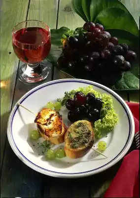 Cut the baguette into slices. Spread half of it with herb butter. Drizzle the rest with olive oil. Cut sheep's cheese into thin slices and place on top. Put 2 different slices on skewers and bake in the oven (electric cooker: 225 ° C/ gas: level 4) until golden brown. Then arrange the skewers with a salad and grape garnish