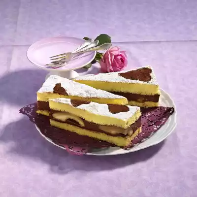 In the meantime peel and halve the pears and cut out the core. Boil 100 ml water, 70 g sugar and lemon juice. Simmer the pears for 5-10 minutes. Drain the pears and let them cool down. Cut the sponge cake base in half crosswise. Cover one base with a cake frame. Put 1/3 of the pudding mixture on top. Place the pears on top. Pour the rest of the custard onto the pears and smooth it down. Put the second sponge cake on top and press it a little bit firmly. Chill the cake for 2-3 hours. Dust the cake with icing sugar. Then dust the pears with cocoa powder using a stencil. Cut into 12 triangles