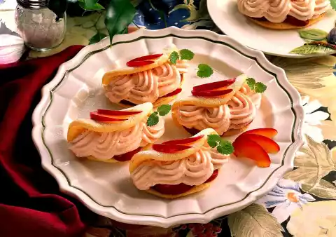 Bake the rest of the bikuit mixture in the same way. For the filling soak gelatine in cold water. Put half of the plums briefly in boiling water, rinse with cold water and peel off the skin. Cut the plums in half, stone and puree.