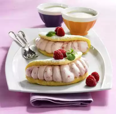 Spread half of the dough into the circles and spread. Bake the omelettes in a preheated oven (electric cooker: 200 °C/ convection oven: 175 °C/ gas: level 3) for approx. 8 minutes. Turn the omelettes onto a tea towel sprinkled with sugar and cover with another, moistened tea towel. Do the same with the other half of the dough and let the omelettes cool down. Wash the mint, dab dry and remove the leaves. Mix quark, 1 packet of vanilla sugar and 5 tablespoons of sugar. Stir in the cream stabiliser and allow it to trickle in. Set aside some nice raspberries for decoration. Whip the cream until stiff and fold into the cream. Fold in the remaining raspberries as well. Pour the cream into a piping bag with a large perforated spout.