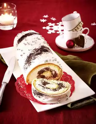 Sift 8 tbsp. icing sugar and mix with approx. 2 tbsp. water. First coat the roll with approx. 2/3 glaze, then spread the remaining glaze in strips. Decorate with ground poppy seeds and sugar beads. Chill for about 30 minutes until the glaze has set.