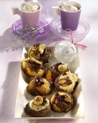 Place 1 teaspoon each of light and dark pastry on a baking tray lined with baking paper and press 1 nut into it. Sprinkle some cookies with chocolate rolls. Bake in the preheated oven (electric cooker: 175 °C/circulating air: 150 °C/gas: level 2) for about 20 minutes. Let them cool down