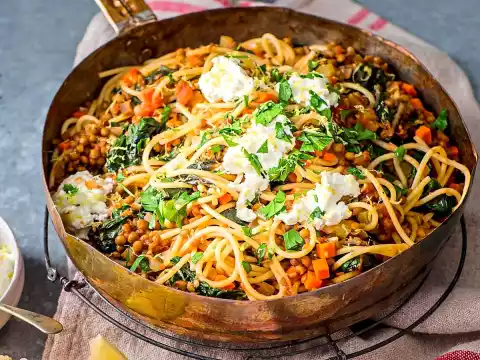 Fry the carrots, onions and garlic in hot oil. Add the lentils, tomatoes and vinegar and steam for about 10 minutes. Cook spaghetti in boiling water according to package instructions. Sort and wash the spinach, stir into the lentil vegetables and let it collapse.
