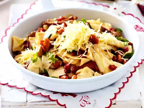Add the stains and bacon to the pan. Fry everything briefly while turning. Season to taste with salt and pepper. Serve and sprinkle with cheese. Drink tip: dry red wine, e.g. Zweigelt.
