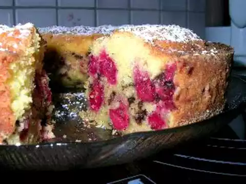 Now stir the chocolate sprinkles, the zucchini shavings and the sour cherries into the rest of the dough and also fill into the mould. Bake the cake at 180°C for about 30 minutes, then sprinkle with sugar.