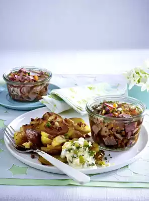 Peel and finely dice red onions. Peel and finely dice the carrots. Clean and wash radishes and cut into thin slices. Cut ham into cubes. Wash herbs, shake dry. Cut chives into fine rolls, chop parsley finely. Put something aside for garnishing. Mix the rest with the prepared ingredients and season everything with pepper. Divide into 6 preserving jars (approx. 290 ml each)