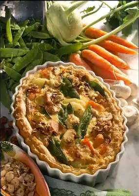 Separate the deep-frozen puff pastry slices and defrost at room temperature for about 30 minutes. In the meantime, clean, wash and slice the carrots. Peel, wash, quarter and slice the kohlrabi. Wash and clean the sugar peas. Clean and halve mushrooms. Put carrots and kohlrabi in boiling salted water, cook for about 4 minutes. Add the sugar peas 1 minute before the end of the cooking time. Drain the vegetables and let them drain well. Heat the oil in a pan and fry the mushrooms in it until golden brown. Season to taste with salt and pepper. Grease a flat casserole dish and sprinkle with breadcrumbs. Place the puff pastry slices on top of each other and roll out into a rectangle (35 cm x 25 cm) on a floured work surface. Lift the puff pastry into the tin and press it on. Put the vegetables into the casserole dish. Whisk cream and eggs. Season with salt, pepper, paprika and nutmeg. Pour the egg milk over the casserole. Fry the hazelnut flakes in a dry pan until golden brown. Sprinkle the casserole with cheese and hazelnut flakes. Bake in the preheated oven (electric cooker: 200°C / gas: level 3) for approx. 45 minutes. After 30 minutes baking time cover the casserole with parchment paper. Serve immediately