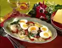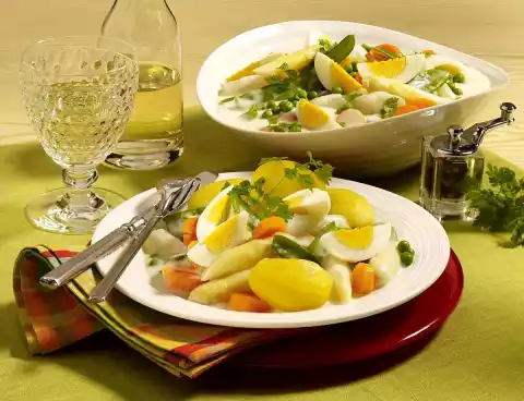 Pour milk and vegetable stock into the roux while stirring, bring to the boil and season with salt, pepper and a little nutmeg. Add the vegetables to the sauce and carefully fold in the eggs. Arrange potatoes and egg ragout on plates.