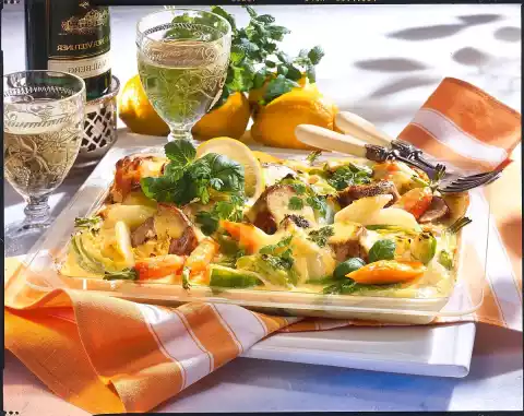 Cut the fillet into slices. Arrange vegetables and meat in a flat casserole dish (approx. 27.5 x 33.5 cm). Pour lemon béchamel over it. Bake in a preheated oven (electric: 200 °C/ gas: level 3) for approx. 20 minutes. Garnish with chervil, basil, lemon balm and lemon slice if desired.