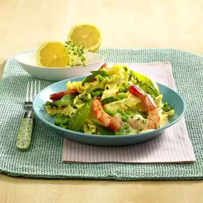 Halve the lemon and squeeze the juice. Melt the fat in a saucepan. Dust with flour and sweat it on. While stirring, deglaze with stock and cream. Stir in lemon juice. Season with salt and pepper. Cook pasta in boiling salted water according to package instructions. Meanwhile peel prawns, except for the tail fin, and remove the intestines. Wash the shrimps and pat them dry. Heat the oil in a pan. Fry prawns on each side for about 2 minutes. Season with salt. Warm the vegetables, except for a few sugar snap peas, in the hot béchamel sauce.