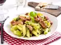 Drain the noodles and chill in cold water. Mix béchamel sauce and noodles. Place the prawns on top. Open the remaining sugar snap peas and fold them apart. Garnish with lemon peel and sugar snap peas. Cut the cress from the bed and sprinkle over it