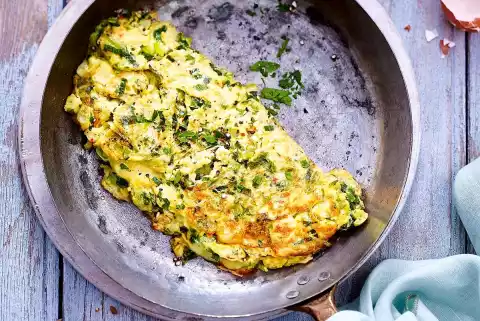 Heat butter in a large pan with lid. Sauté spring onions for 2-3 minutes. Pour egg mixture over it and let it simmer covered at low heat for 12-15 minutes. Turn into an omelette with a spatula and sprinkle with coarse pepper as desired. Bread and butter goes well with it.
