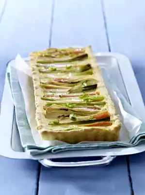 Bake the tart in the preheated oven (electric oven: 200 °C/ convection oven: 175 °C/ gas: level 3) on the lower rack for 35-45 minutes. Remove from the mould. Cut the remaining spring onion into fine rolls and sprinkle on the tart