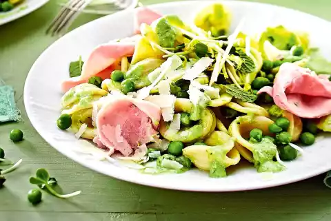 Cut cress from the bed. Carefully wash the sprouts and drain them well. Grate the parmesan and pluck the ham. Arrange pasta with remaining peas and ham. Sprinkle with parmesan, cress and sprouts.