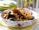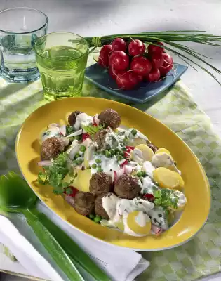 Mix 300 g herb quark, salad cream and vinegar. Wash the chives, dab dry and cut into fine rolls, stir into the salad cream and season well with salt and pepper. Slice the potatoes, mix with the peas, radishes and meatballs, add the salad dressing. Garnish with chervil twigs