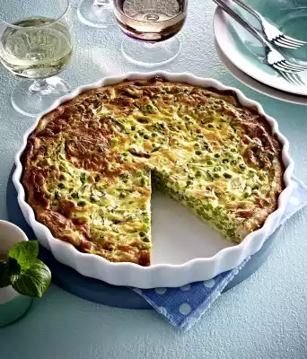 Roll out the short pastry and line a greased tart tin (approx. 23 cm Ø) with it. Cut off any protruding edges approx. 1 cm above the edge and fold inwards. Use dough remains for other purposes, e.g. for biscuits. Prick the base with a fork. Pour in the pea and egg mixture and bake in the preheated oven (electric cooker: 175 °C/ convection oven: 150 °C/ gas: see manufacturer) for 30-40 minutes. Serve hot or cold