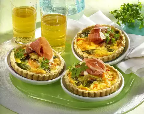 Mix 3 eggs and sour cream, season. Spread with vegetables on the bottoms. Bake in the preheated oven (electric cooker: 200 °C/circulating air: 175 °C/gas: level 3) for approx. 25 minutes. Serve with a slice of ham
