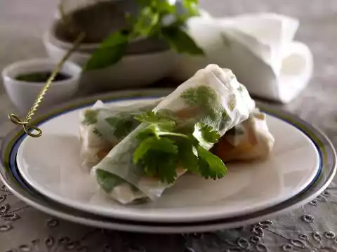 Take it out and place it on a damp cloth. Place the meat, carrots, basil and coriander in the middle, fold the sides and form a roll. Serve with soy sauce. Use the stock for the main course.