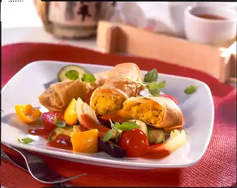 Add to the vegetables 5 minutes before the end of the cooking time. Pluck the oregano leaves from the stalks and sprinkle over them. Heat the oil and fry the spring rolls until golden brown, turning them over. Drain well on kitchen paper. Arrange the vegetables with two spring rolls on plates