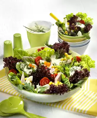 Wash and halve tomatoes. Cut eggs into slices. Drain corn. Mix salads, tomatoes, turkey cold cuts and corn in a large salad bowl. Pour some of the yoghurt sauce over it and garnish with dill. Rest of sauce extra rich