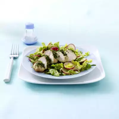 Add 1 teaspoon of oil. Mix salad, spring onions and ##radish##, pour vinaigrette over it. Let it steep a little. Wash the meat and dab dry. Brush a small coated pan with oil, heat it up.