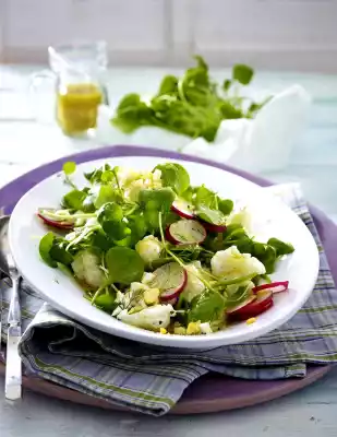 Stir the dill and shallot into the vinaigrette. Clean, wash and dry purslane. Clean, wash and slice the radishes. Mix the eggs, purslane, cauliflower and radishes, arrange and sprinkle with vinaigrette.