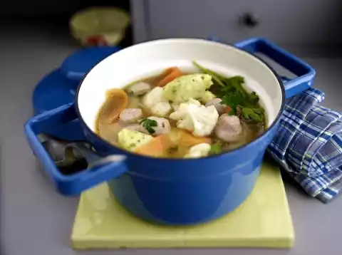 Put the vegetables in 2 l chicken stock, bring to the boil and simmer for about 15 minutes. Press small dumplings from the sausage casing directly into the soup and simmer for about 10 minutes. Heat semolina dumplings in the soup for 1-2 minutes.