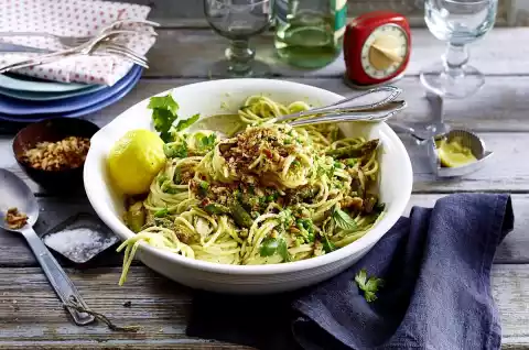 Wash herbs, shake dry and pluck leaves from the stems. Drain the pasta, mix the sauce and asparagus, arrange on a plate and sprinkle with crumbs and herbs. Garnish with the lemon halves if desired.