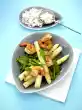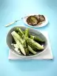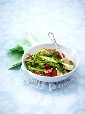 Wash the tomatoes, dab dry and cut in half. Heat the oil in a pan. Fry the meat for 3-4 minutes while turning, season with salt and pepper and remove. Add asparagus to the hot frying fat and fry for 3-4 minutes, season with salt and pepper and remove.