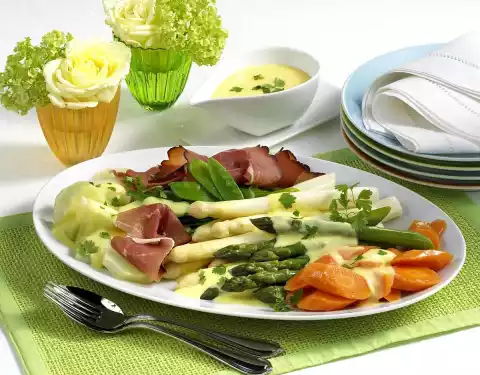 Clean and wash the sugar snap peas. Cook white asparagus in plenty of boiling salted water with a little sugar for about 15 minutes. Add green asparagus, carrots and kohlrabi after 5 minutes. Cook the sugar snap peas for the last 8 minutes.