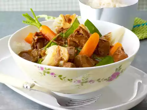 Remove the meat from the bone and cut into bite-sized pieces. Re-heat with the vegetables in the sauce at low heat. Season to taste again. Basmati rice tastes good with it.