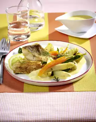Wash the fish and dab dry. Season with salt and pepper and turn in flour, tap off. Heat oil in a pan. Fry pike-perch for 2-3 minutes on each side. Remove vegetables from the frying tube. Arrange on plates with the fish and sauce. Garnish with remaining dill and lemon slices