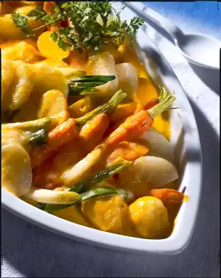 Wash the potatoes thoroughly and cook in boiling salted water for about 20 minutes. In the meantime, clean the carrots (leave some green to stand as desired), wash and possibly halve them. Clean and wash spring onions and kohlrabi.