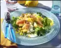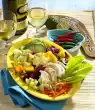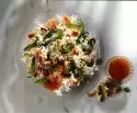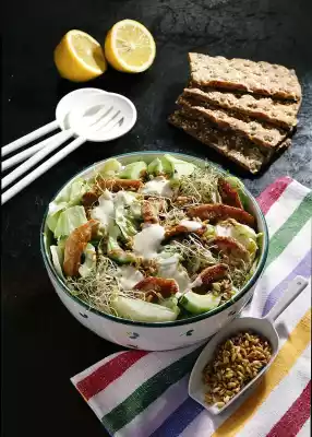 Soak oat grains the day before covered with water. Then bring to the boil in the broth and cook for 15 minutes. Wash the meat, dab dry and cut into strips. Heat the oil in a coated pan and fry the meat for 2-3 minutes, turning. Season with salt and pepper. Clean, wash and cut the salad into strips. Peel and halve the cucumber, remove seeds if necessary and cut into slices. Wash the sprouts and let them drip off. Mix all ingredients in a bowl. Mix salad-yoghurt cream, milk and lemon juice. Season with salt, pepper and sugar. Pour the sauce over the salad, mix and allow to soak