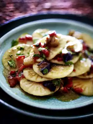 Heat 2 tablespoons of oil in a coated frying pan. Fry the aubergines, onion and garlic for 4-5 minutes while turning. Add paprika and fry for 2-3 minutes. Mix the stock, vegetable stock, starch, sugar and 2 tbsp. oil. Deglaze the vegetables with it, bring to the boil again, remove from the stove