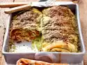 Mix flour and semolina. Add 250 ml water, 3 tablespoons of oil and 1 tablespoon of salt. Knead first with the dough hooks of the hand mixer, then with your hands to a smooth dough. Form into a ball, wrap in foil and chill for approx. 30 minutes