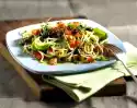 Bring plenty of salted water to the boil in a large pot. Simmer the noodles for 6-7 minutes. Take off some pasta water and put it aside. Pour the noodles into a sieve, rinse briefly, add to the vegetables with coriander, stir, dilute with some of the noodle water if necessary. Season with salt and pepper and arrange on plates