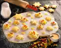 Cover and leave to rest for approx. 1 hour in the refrigerator. Then roll out in portions on a floured work surface to a thickness of approx. 5 mm. Cut out stars in 2 different sizes (with 6 prongs, approx. 9 cm Ø; gives 18 stars; with 8 prongs, approx. 6.5 cm Ø; gives 22 stars).
