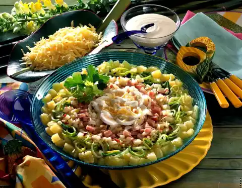 Clean and wash the leek and cut into fine rings. Finely dice the ham. Coarsely grate cheese. Put all ingredients, except the cheese, in layers in a bowl. Mix Miracel Whip and sour cream.